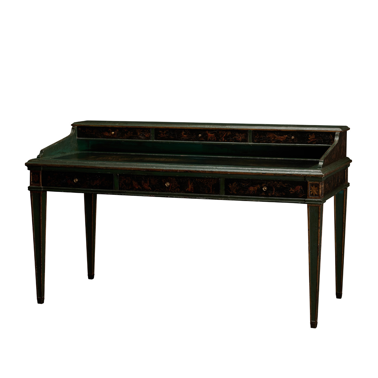 Desk featuring integral hutch with three drawers, three additional drawers in apron, inset leather top, atop tapering legs.